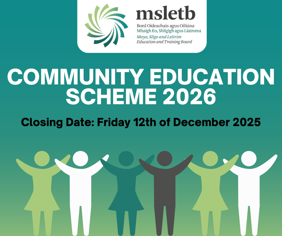 Mayo, Sligo and Leitrim Education and Training Board is the leading provider of education and training in the region. As an integral part of our communities, we deliver educational services to 30,000 children, young people, and adults through our 19 schools, 12 Further Education and Training Centres, 5 Youthreach Centres and 2 Training Centres. We are responsive to the needs of learners, employers, and communities across the counties of Mayo, Sligo and Leitrim, and aim to provide a positive experience for our learners in a professional, caring and collaborative environment. This operation is co-funded by the Government of Ireland and the European Union.